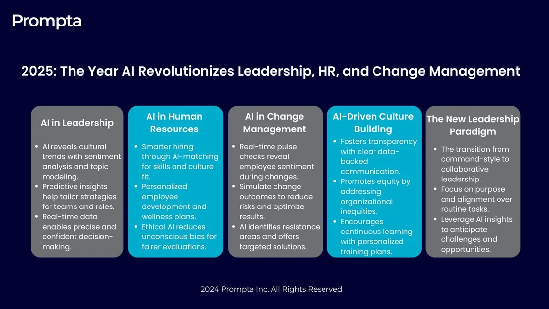 In 2025, leaders will continue leveraging tools like Prompta AI to co-create more inclusive, innovative, and adaptable cultures. This shift provides:
